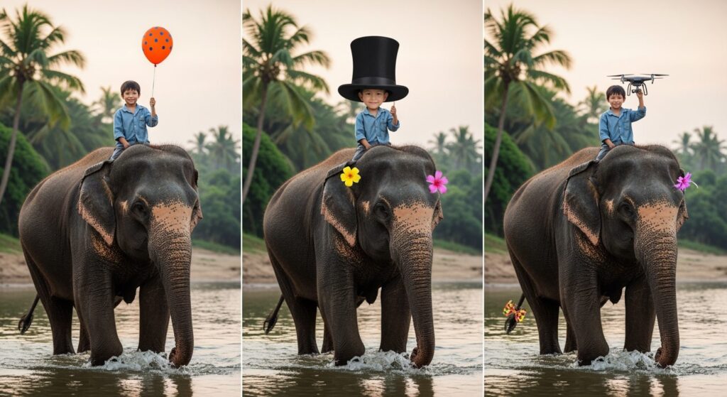 - Focus on high-detail areas like the boy’s clothing or the elephant’s features